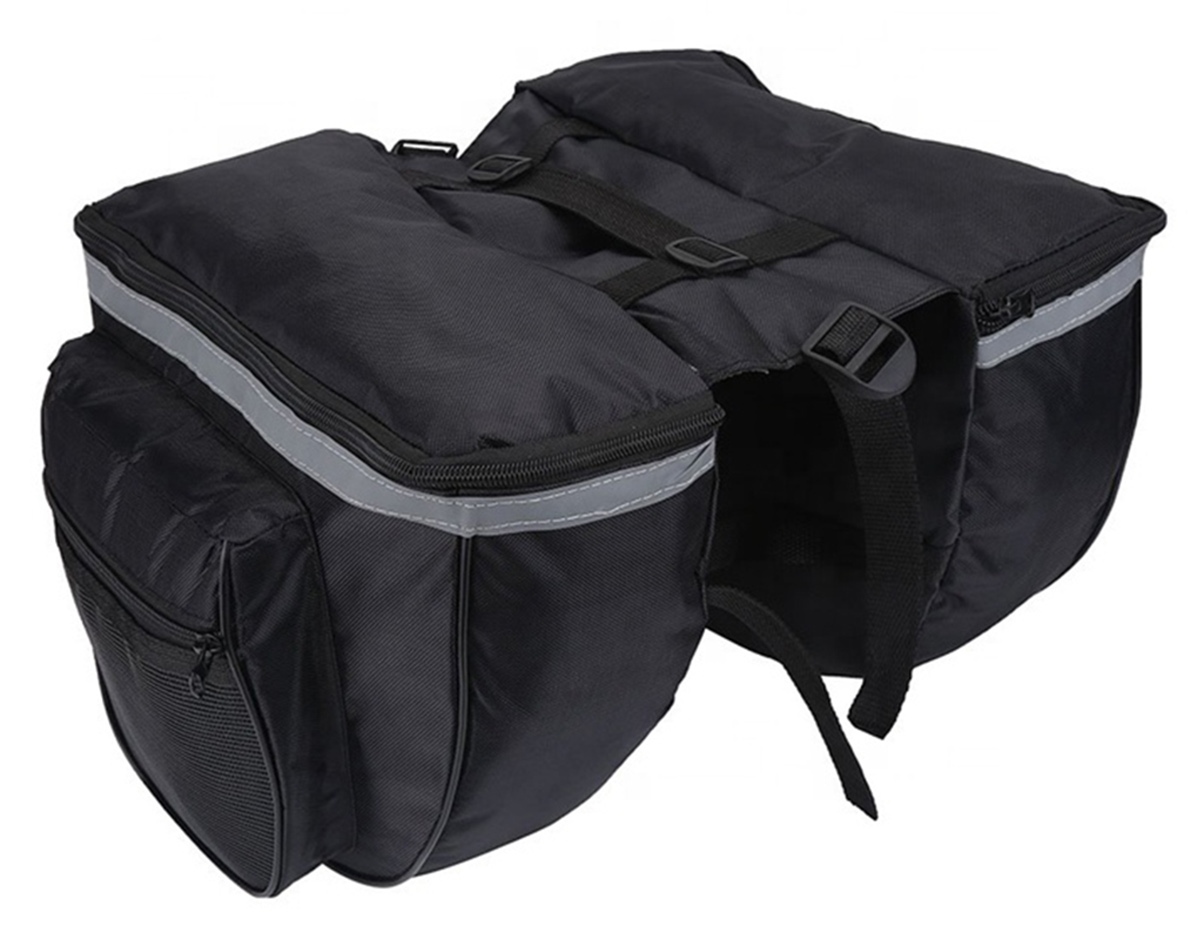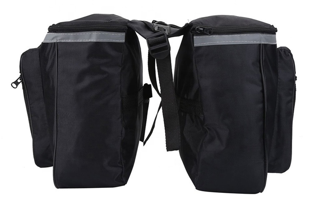 Geantă de bicicletă spațioasă cu 4 compartimente pentru suportul din spate. Necesar și extrem de util în timpul călătoriilor cu bicicleta mai lungi și mai scurte. Asamblarea foarte rapidă este asigurată de utilizarea Velcro durabil. Toate cele patru compartimente sunt fixate cu fermoar, astfel încât niciun obiect să nu cadă din ele în timpul conducerii. Geanta este fabricată din poliester durabil, rezistent la stropiri și condiții meteorologice dificile. Siguranța ciclistului este sporită de strălucirea suplimentară din jurul sacului.