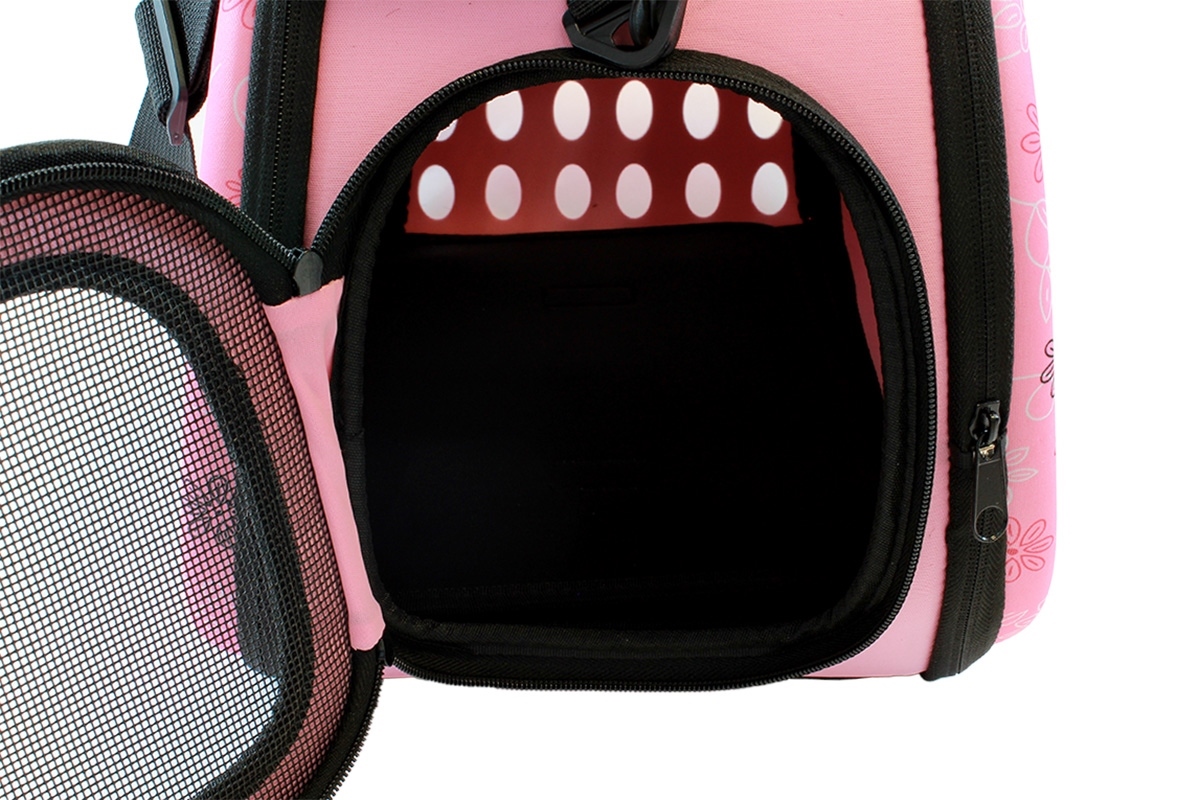 Geantă de transport de înaltă calitate pentru animalele de companie mici. Perfect pentru a ne muta pisica sau iepurele la orice distanță. Designul extrem de confortabil va asigura confort atât pentru noi cât și pentru animale. Materialul puternic din care au fost confecționate transportoarele, un mâner solid și o curea de umăr reglabilă asigură o utilizare lungă și fără probleme a produsului. Geanta este respirabilă și sigură pentru animalul de companie datorită sistemului de ventilație. Confortul de utilizare este asigurat și de un fermoar dublu pe ambele părți ale suportului.