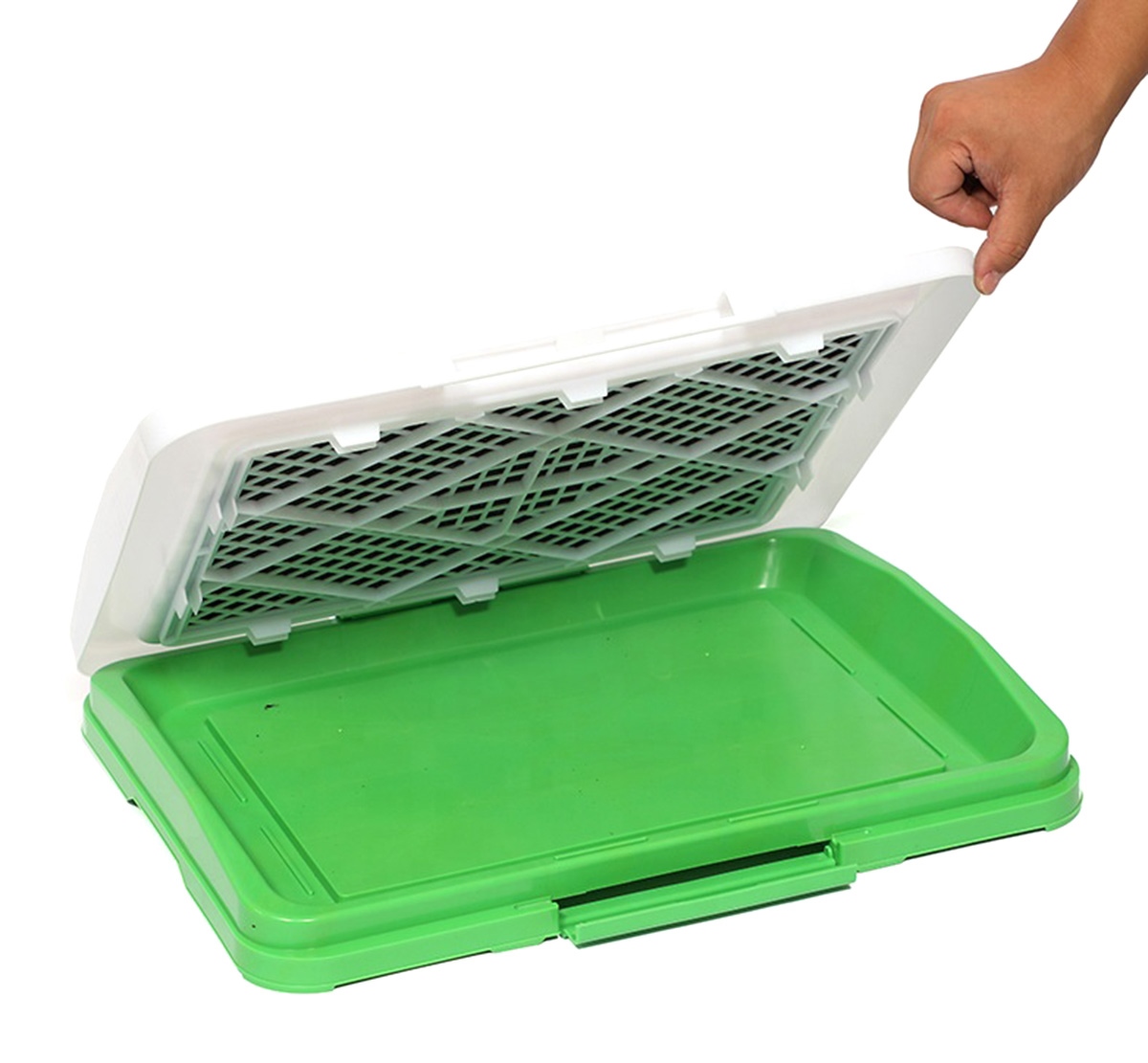 - Iarba sintetică, moale, care căptușește cutia de gunoi nu rănește labele câinelui, nu absoarbe mirosurile, este antibacteriană, sigură pentru câinele tău.