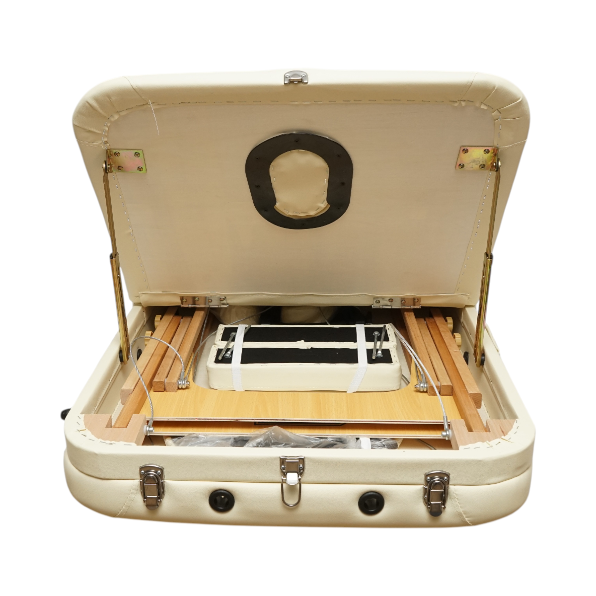 Masa de masaj pliabila, 3 zone, cadru lemn, spuma 5cm, inaltime 55-76cm, piele ecologica, dimensiuni 60x213cm, culoare Crem