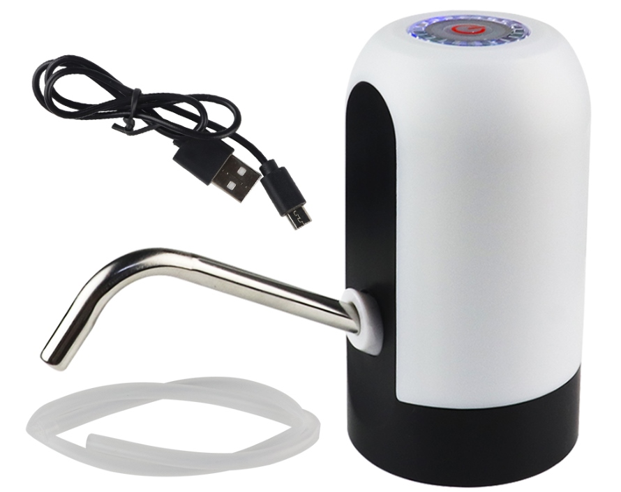 Pompa electrica de apa. Vă permite să turnați apă din sticle mari și incomode cu o capacitate mare în sticle sau vase mai compacte. Nu necesită alimentare de la rețea (bateria încorporată încărcată printr-un port USB standard). Dimensiunile compacte facilitează montarea dozatorului pe gura cilindrului. Tubul de oțel facilitează turnarea apei în pahare. Tubul lung de aspirație și performanța înaltă accelerează pomparea.