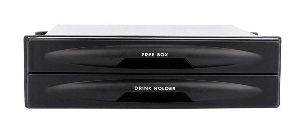 - Buzunarul are două sertare (cel superior servește ca spațiu de depozitare, iar cel inferior cu un suport clasic pentru pahare).