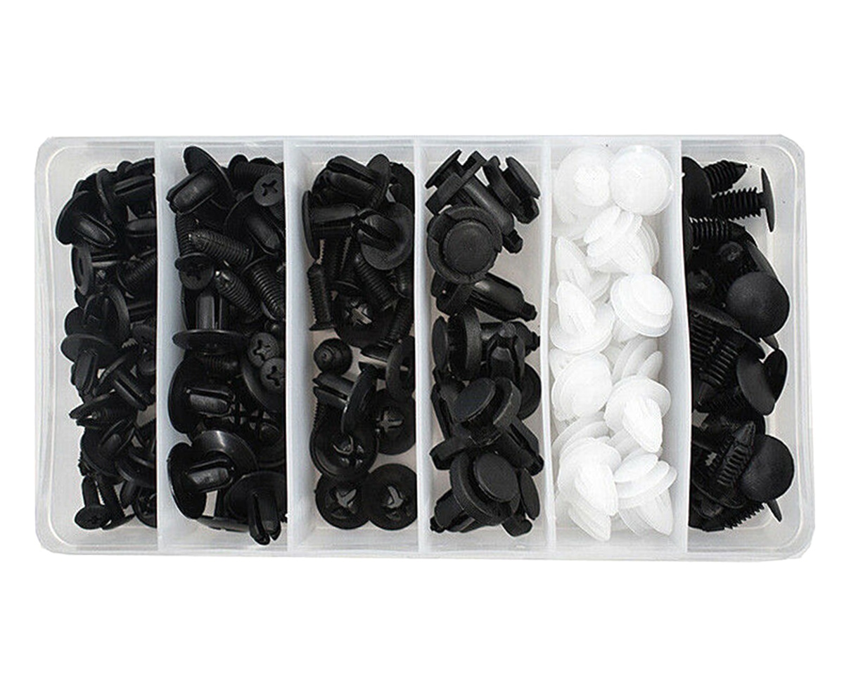 Set de 100 de clipsuri universale pentru mașină. Setul include 6 cele mai populare tipuri de cleme, sortate în 10 și 20 de bucăți. O carcasă convenabilă, compactă, cu compartimente, împiedică amestecarea elementelor setului. Toate camerele carcasei sunt semnate, ceea ce facilitează găsirea clemei potrivite.