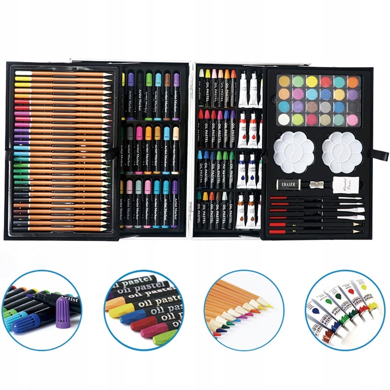 Acest produs iese în evidență față de alte seturi artistice pentru că este închis într-o valiză îngrijită, întărită, din plastic rezistent. Toate elementele setului sunt bine plasate în interior, iar totul poate fi închis cu încuietori puternice. Puteți lua setul cu dvs. oriunde datorită mânerului confortabil.