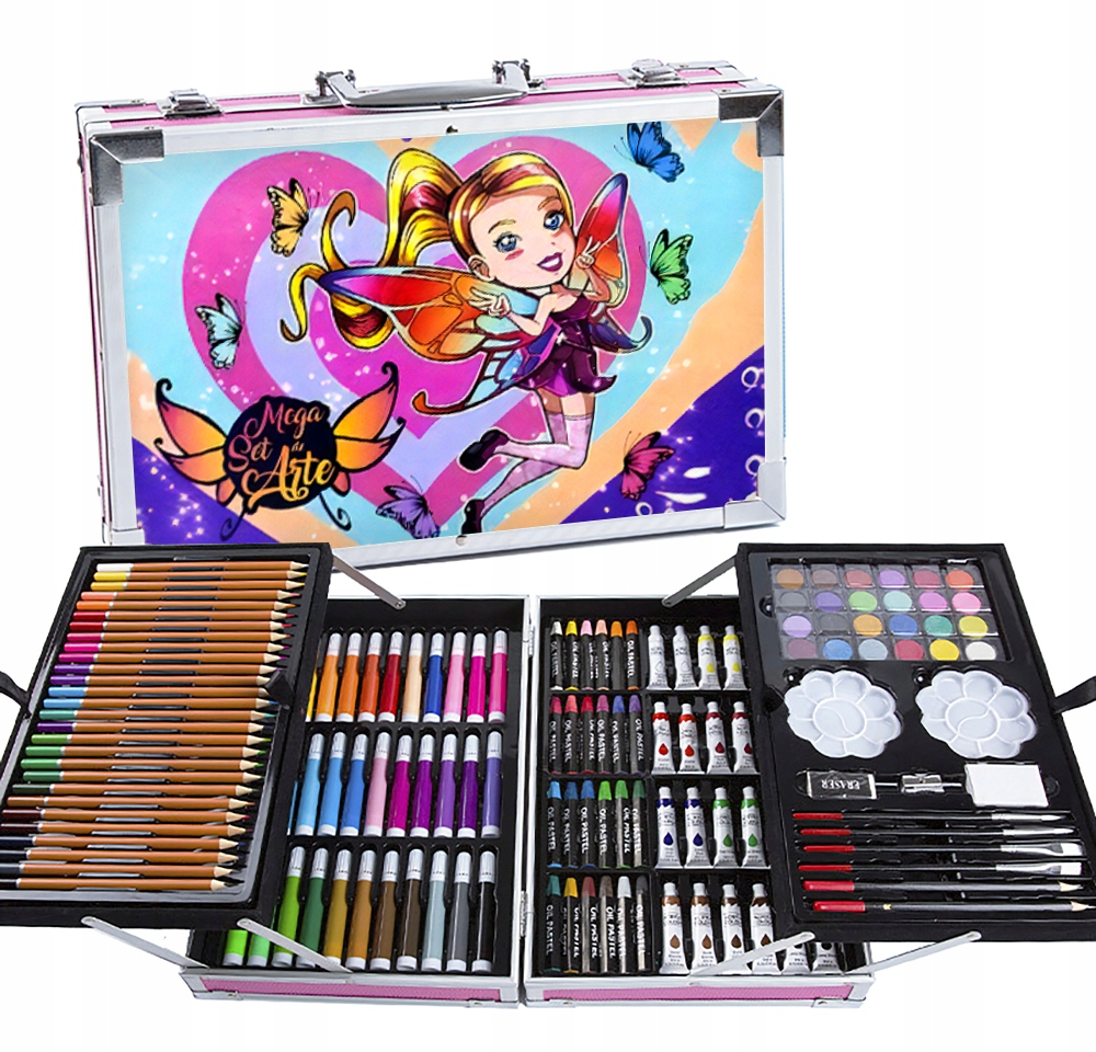 Setul nostru de artă are câte ceva pentru toată lumea – pixuri de colorat , creioane colorate și vopsele de pictură . Toate acestea în culori saturate care arată grozav pe hârtie. Totul este închis într-o valiză confortabilă care poate fi ușor pliată, închisă și luată cu tine – la școală , grădiniță, cursuri de artă sau într -o excursie pentru a picta în aer liber!