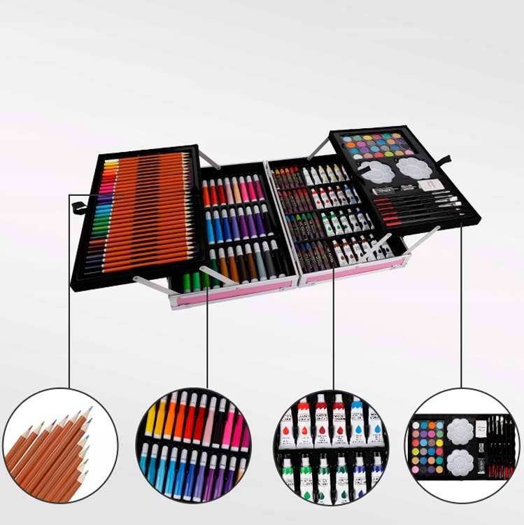 Acest produs iese în evidență față de alte seturi artistice pentru că este închis într-o valiză îngrijită, întărită, din plastic rezistent. Toate elementele setului sunt bine plasate în interior, iar totul poate fi închis cu încuietori puternice. Puteți lua setul cu dvs. oriunde datorită mânerului confortabil.