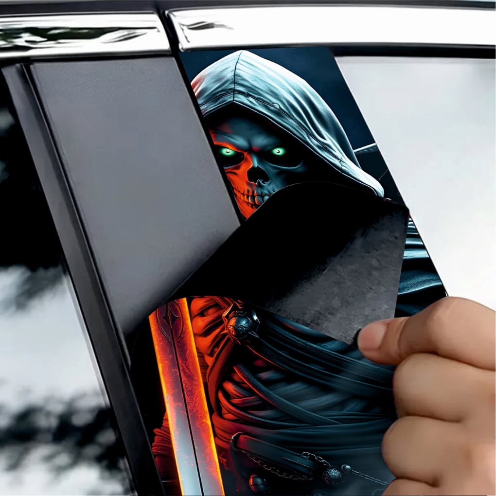 Set 2 folii printate outdoor pentru colantarea stâlpilor ușilor autoturismului dvs. Folia imprimată cu EcoSolvent Outdoor aderă pe orice suprafață plană, netedă. În cazul suprafețelor rugoase, aderența produsului va scadea considerabil.