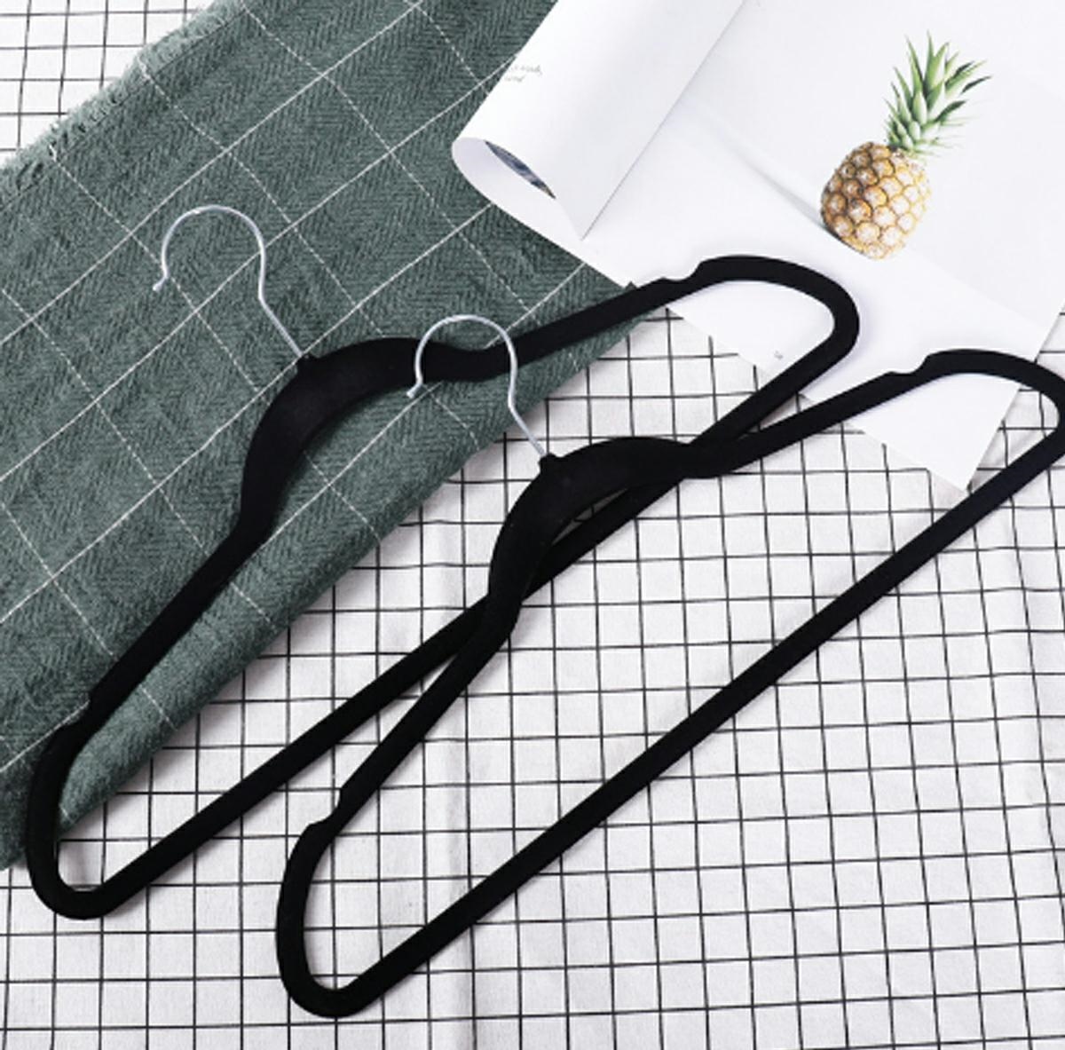 Un set de 20 de umerase acoperite cu catifea moale. Designul ușor și bine gândit vă permite să agățați toate tipurile de haine. Învelișul de catifea împiedică hainele să alunece, iar cârligul cromat poate fi rotit în orice unghi. Baza largă permite agățarea comodă a pantalonilor, iar decupaje suplimentare în partea superioară facilitează agățarea bluzelor pe bretele.