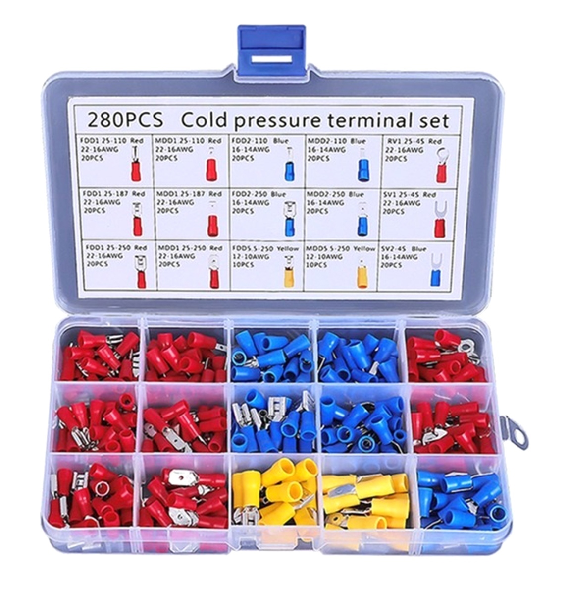 Set de 280 de conectori de sertizare izolați. Setul include 15 tipuri de conectori separați în camere separate. O carcasă convenabilă, compactă, cu compartimente, împiedică amestecarea șuruburilor. Toate camerele carcasei sunt semnate, ceea ce facilitează găsirea conectorului potrivit. Conectorii previn îndoirea excesivă a firelor și coroziunea acestora, asigură o bună izolare.