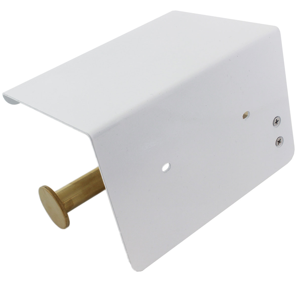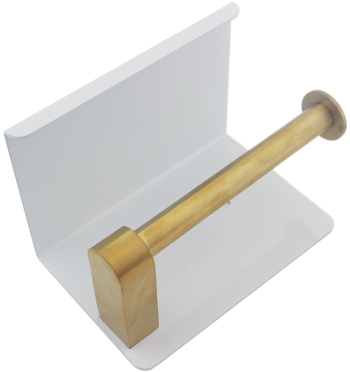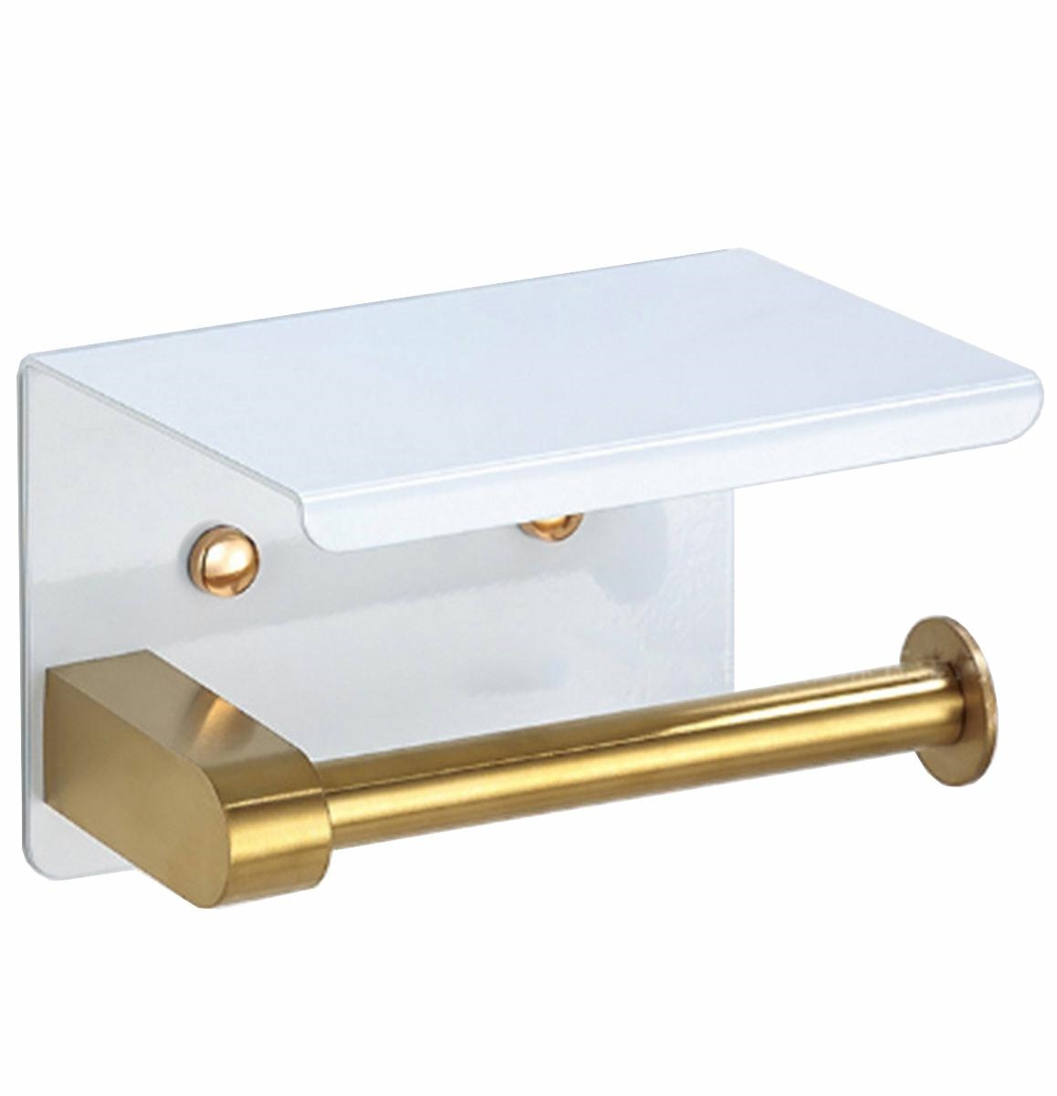 Suport pentru hartie igienica cu raft suplimentar, din otel, culoare alba cu brat auriu