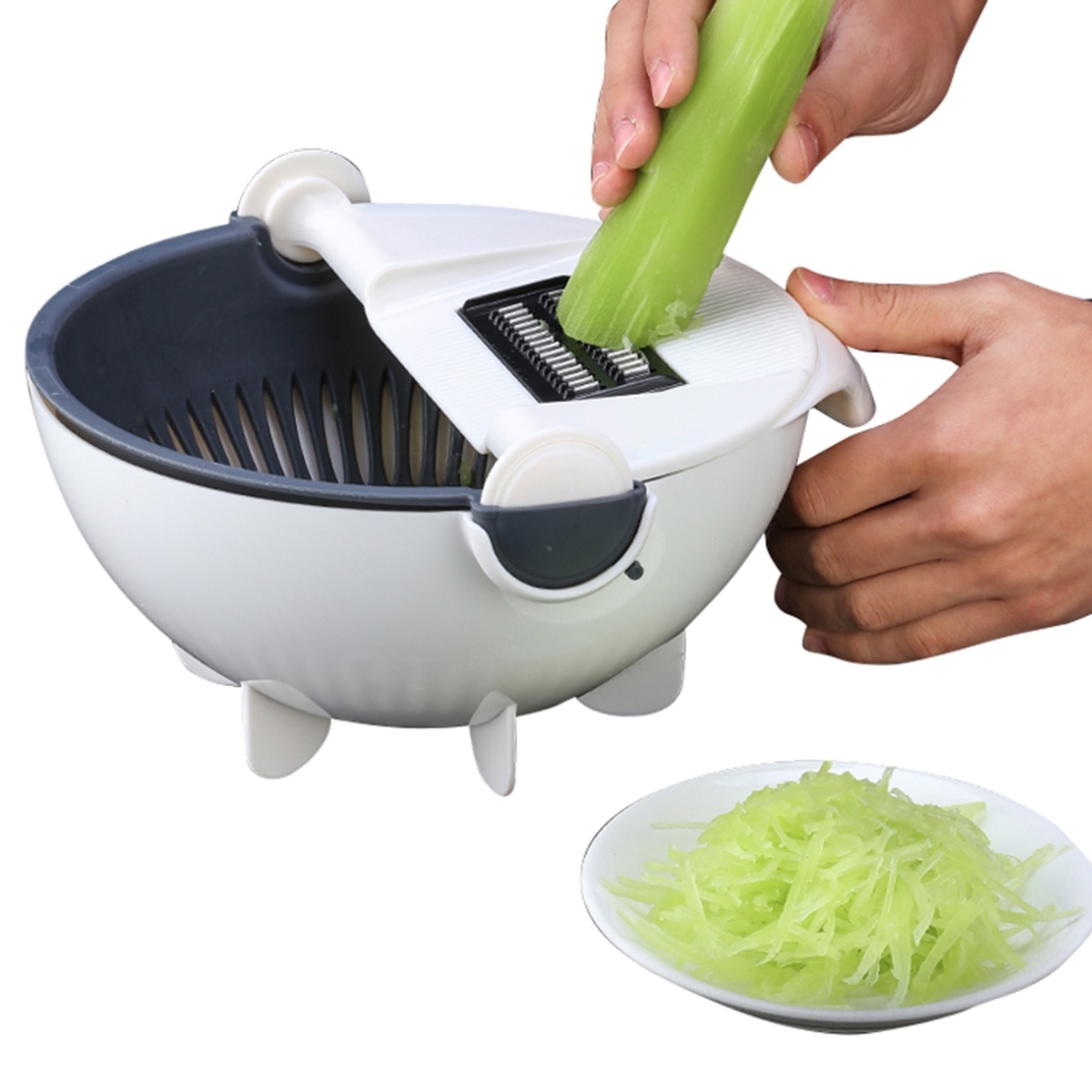 Tăietor de legume rotativ multifuncțional. Răzătoarea va tăia și rade perfect fructele și legumele pentru salată. Setul este echipat cu un drenator rotativ cu sita care faciliteaza eliminarea continua a excesului de apa. Setul include 5 lame înlocuibile adaptate diverselor tipuri de legume/fructe.
