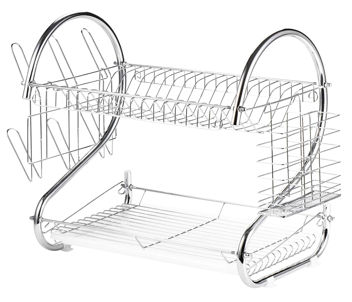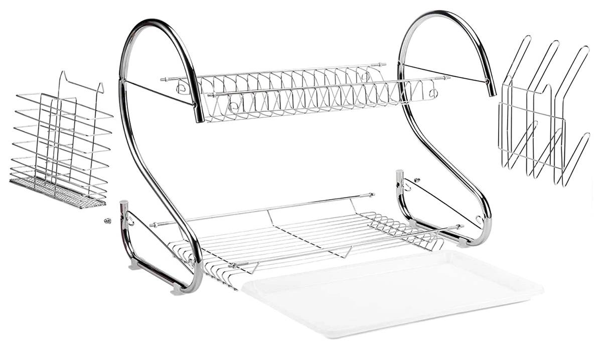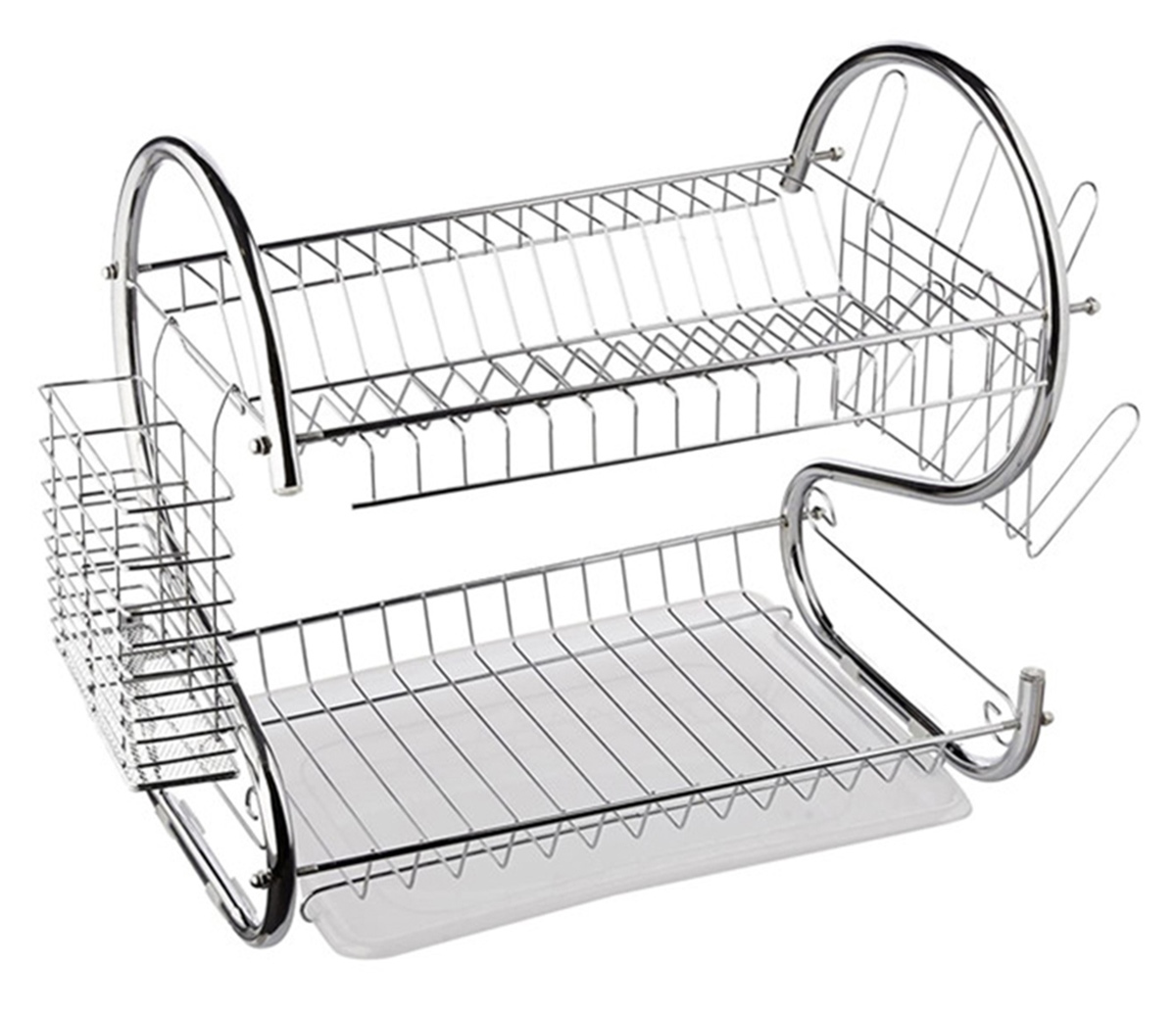 Uscător de vase și tacâmuri de înaltă calitate, cromat, pe două niveluri, cu scurgere. Poate ține cu ușurință până la 15 farfurii la nivelul superior. Pune-ți paharele și paharele în ordinea corectă la nivelul inferior. Este extrem de spatios si este echipamentul necesar pentru fiecare bucatarie! Se va potrivi cu un set de vase și tacâmuri pentru toți membrii gospodăriei! Îl poți ascunde cu ușurință într-un dulap de bucătărie datorită dimensiunilor sale compacte! Are o serie de elemente suplimentare, detașabile, de exemplu, o tavă de plastic pentru colectarea apei, un scurgere suplimentar pentru tacâmuri și un cuier extern pentru până la 6 pahare. Este o adevărată mașină de recoltat de bucătărie, care va organiza eficient toate seturile de feluri de mâncare din bucătăria ta!