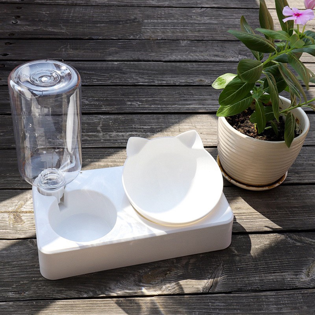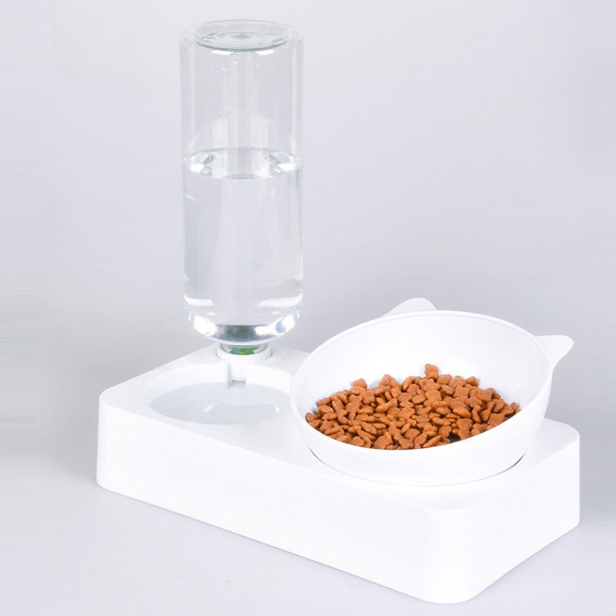 Dozator automat de apă și un bol pentru mâncare pentru pisici. Panta castronului la un unghi de 15 grade face ca animalul tau sa manance mai usor. Sticla de apă cu o capacitate de 0,5 L permite animalului dumneavoastră să aibă acces la apă proaspătă în orice moment. Datorită unei supape speciale, dispozitivul adaugă automat apă din rezervor în vas. Designul compact va funcționa bine în bucătăriile mici și coridoarele.